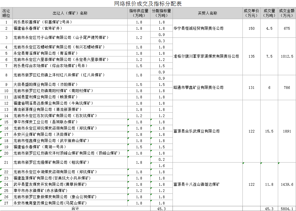| 公告名稱 | 福建省2017年度煤炭去產(chǎn)能指標(biāo)交易網(wǎng)絡(luò)報(bào)價(jià)成交及指標(biāo)分配表 |