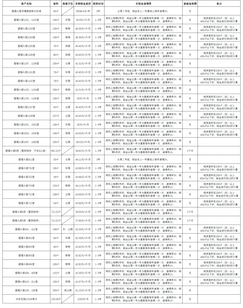 1.1租賃標(biāo)的物為宏楊新城建福大廈(3#樓)若干樓層等房產(chǎn)(詳見(jiàn)附表),座落于福州市楊橋東路118號(hào)。房屋有產(chǎn)權(quán)證,房產(chǎn)具體租賃面積以產(chǎn)權(quán)方確認(rèn)為主。房產(chǎn)面積為大約數(shù),若實(shí)際面積不足,租金底價(jià)不予調(diào)整。