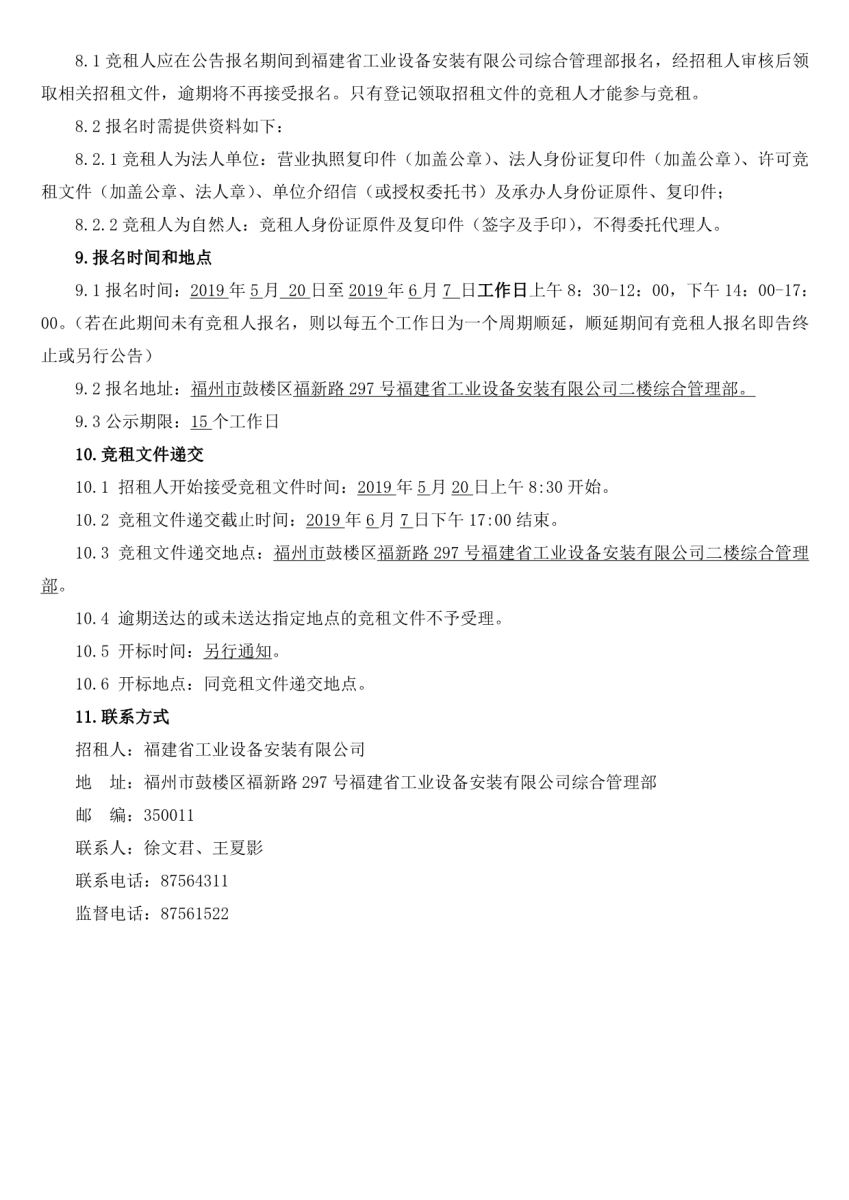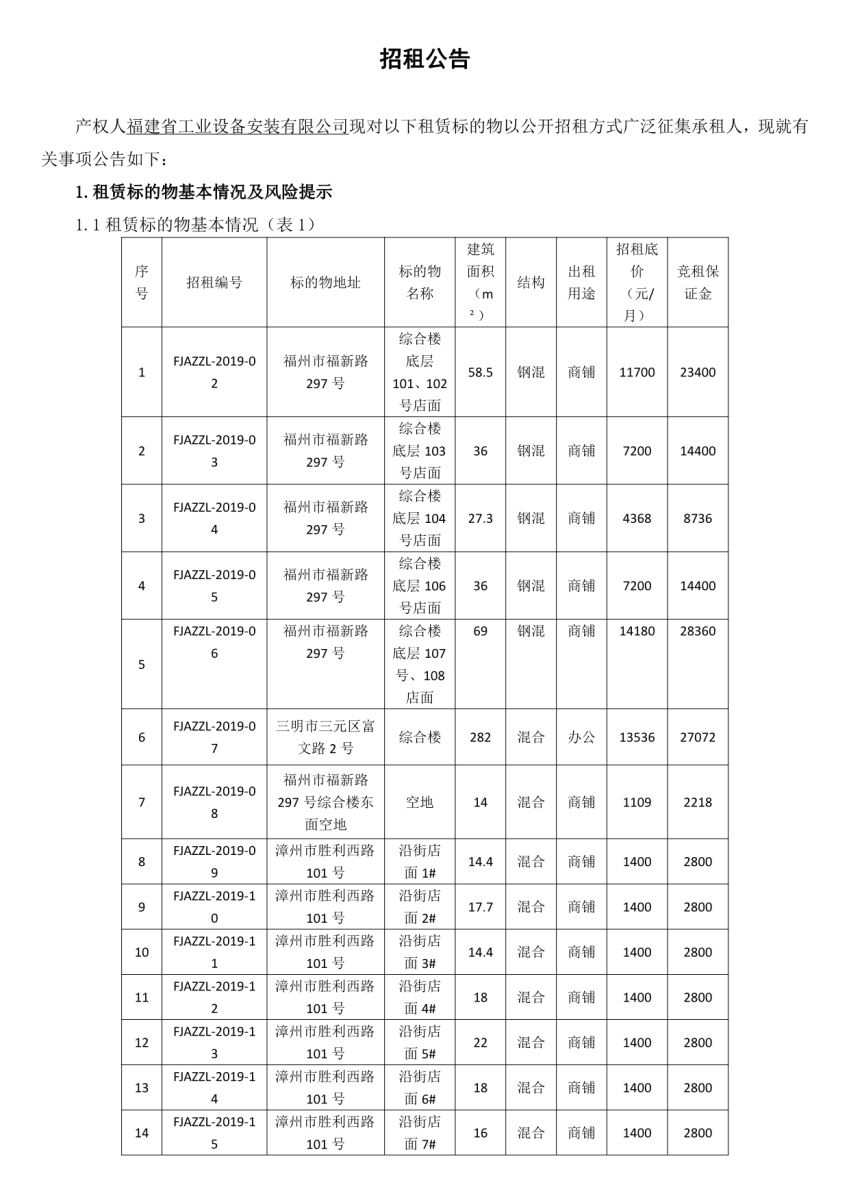 | 名稱 | 福建省工業(yè)設(shè)備安裝有限公司位于福州、三明、漳州三地市資產(chǎn)公開招租公告 |