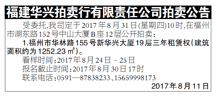 | 名稱 | 福州市鼓樓區(qū)華林路155號新華興大廈19層租賃權拍賣公告 |