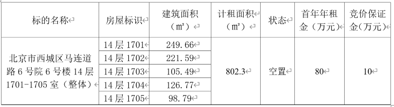 租賃標的地址位于北京市西城區(qū)馬連道路6號院6號樓14層。租賃標的建筑面積約為802.3㎡,現(xiàn)有簡單裝修。