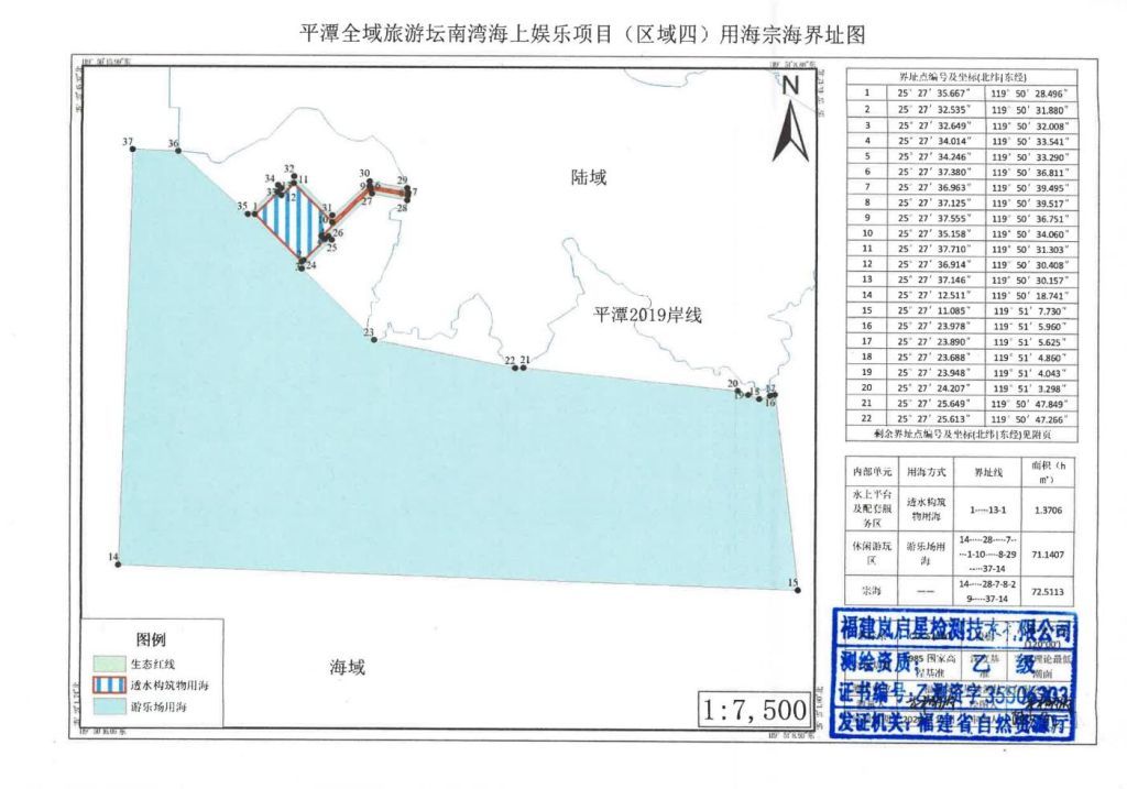 用海面積 72.5113公頃,其中:水上平臺及配套服務(wù)區(qū)用海面積 1.3706公頃、用海方式為“透水構(gòu)筑物”,休閑游玩區(qū)用海面積 71.1407公頃、用海方式為“游樂場”。項目用海符合《平潭全域旅游(壇南灣)海上娛樂項目海域使用論證報告書(報批稿)》要求。 |