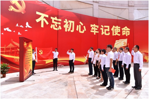 參觀結(jié)束后,支部全體黨員在鮮紅的黨旗前莊嚴(yán)宣誓,重溫入黨誓詞。錚錚的誓言在紀(jì)念館寬闊的廣場上激蕩回響,讓每一位黨員的心靈再次受到震撼和洗禮,重新感受入黨時(shí)那份為共產(chǎn)主義事業(yè)奮斗終身的意志和決心。
