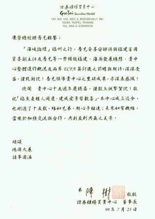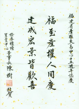 為祝賀福建省產(chǎn)權(quán)交易中心成立十五周年, 臺(tái)灣證券柜臺(tái)買賣中心董事長(zhǎng)陳樹發(fā)來(lái)賀信。