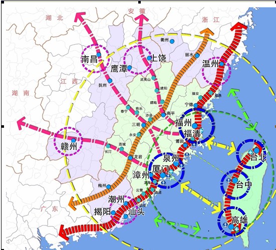 海峽兩岸將形成兩個半小時城際通勤圈 ●海峽城市群突破海峽西岸范疇,成為國際合作的重要窗口●構(gòu)建“福州大都市區(qū)”和“廈泉漳組合大都市區(qū)” ●把平潭建設(shè)成為促進(jìn)祖國和平統(tǒng)一的前沿平臺