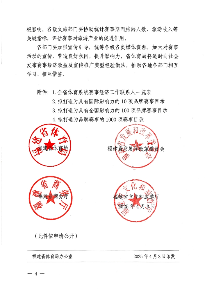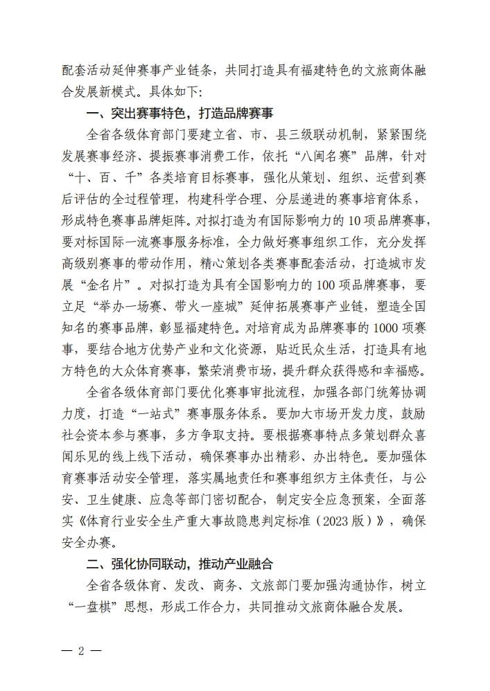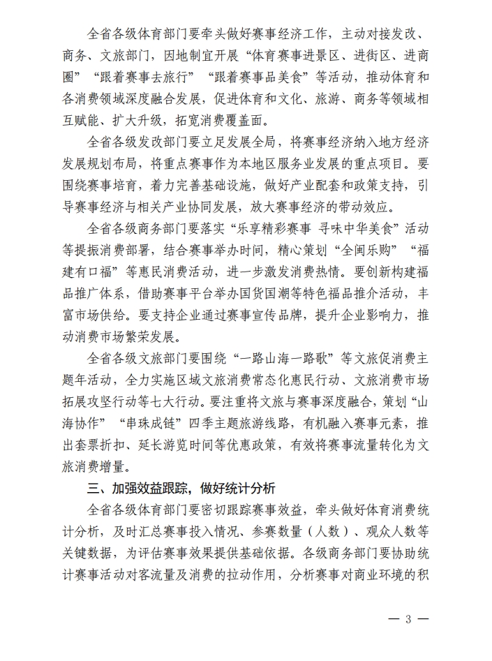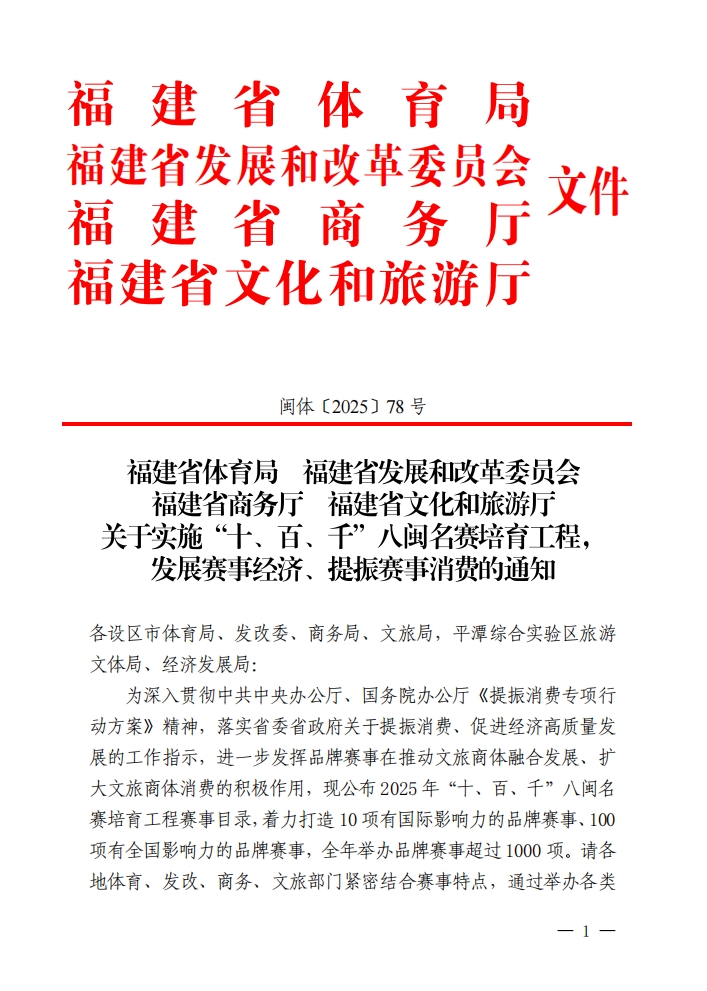 關(guān)于實施“十、百、千”八閩名賽培育工程,發(fā)展賽事經(jīng)濟、提振賽事消費的通知(閩體〔2025〕78 號)