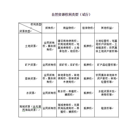 1.明確各類自然資源產權主體權利。根據《自然資源權利類型(試行)》(詳見附件),對自然資源實行權利清單管理,明確各類自然資源產權主體在自然資源產權行使、開發(fā)利用和保護等方面享有的權利及依法應承擔的責任。在符合法律規(guī)定及用途管制的前提下,保護自然資源使用權人的自主權,允許自然資源使用權人根據自然資源的具體情況進行合理開發(fā)利用,不得以任何行政手段干涉其合法生產經營活動。